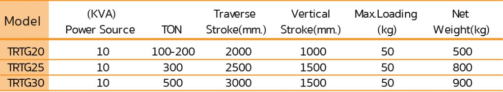 ranges of 100T-500T for take-out product. Traverse axis driven by AC servo motor.